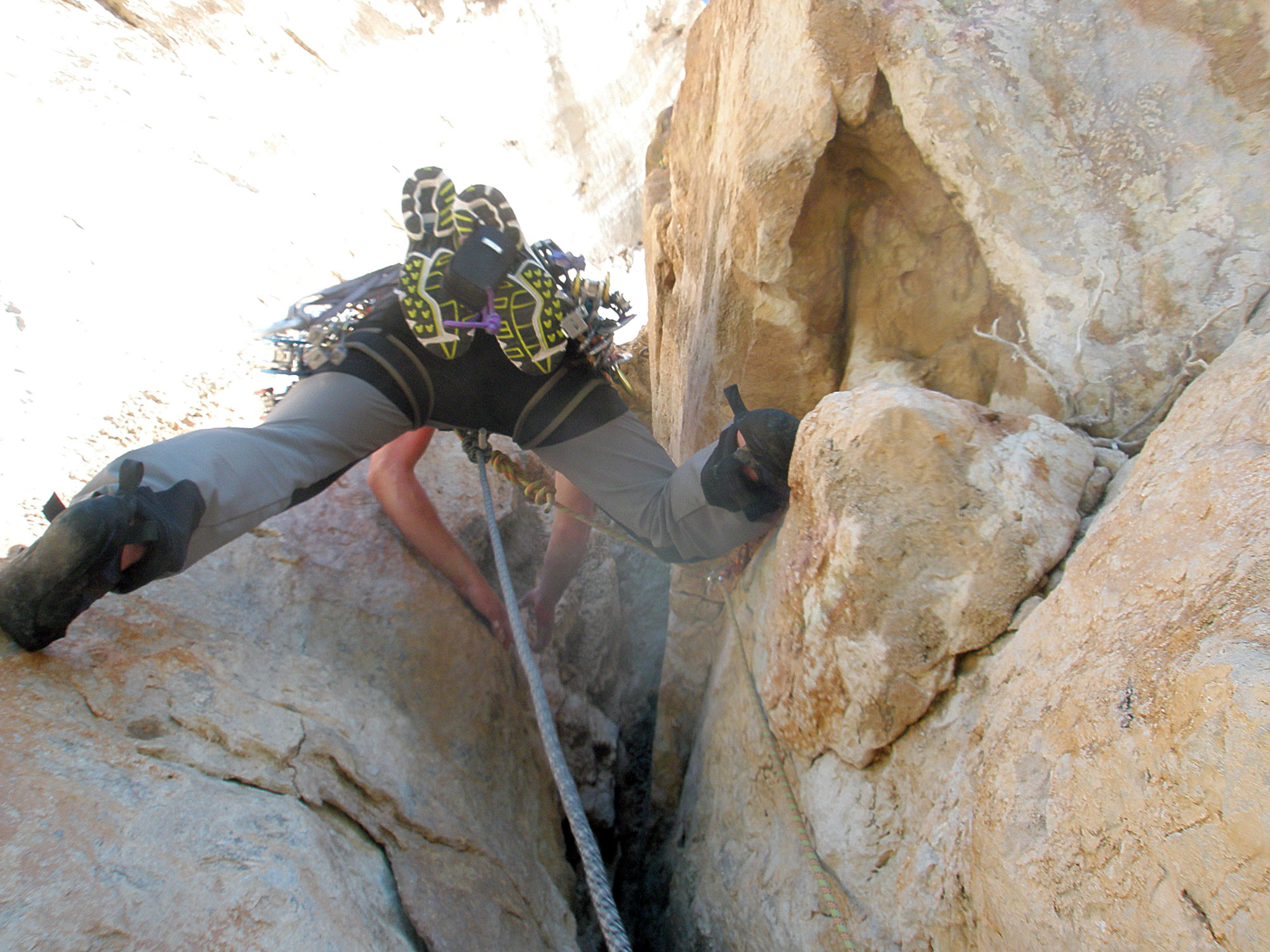 Quico buscando canto en la sombra del diedro por el que comienza el tercer largo.