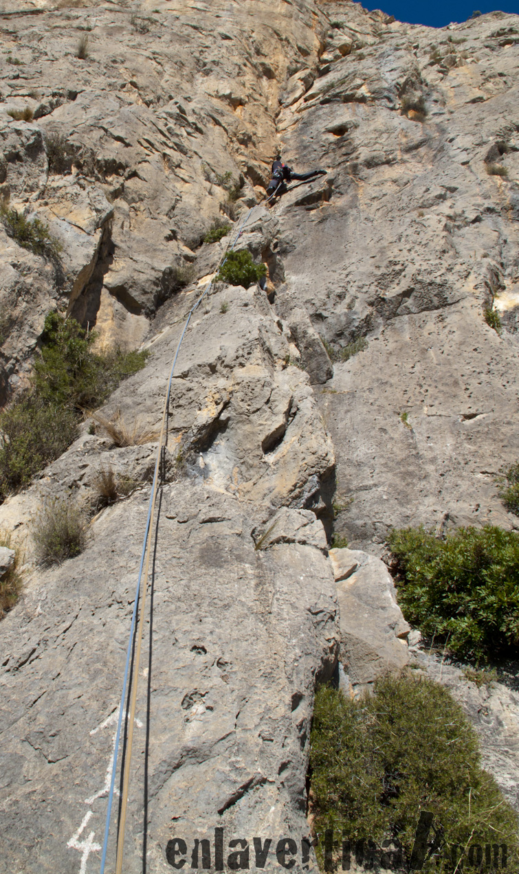 Inicio de la vía Diedros mágicos. Los tres primeros largos discurren por una evidente fisura con mucho canto. Con una cuerda de 60m. tendremos la posibilidad de enlazar el primer y el segundo largo.