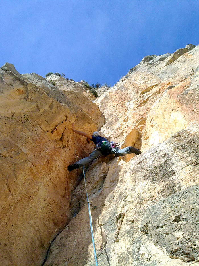 Merli negociando el diedro fantasía, largo clave de la vía.