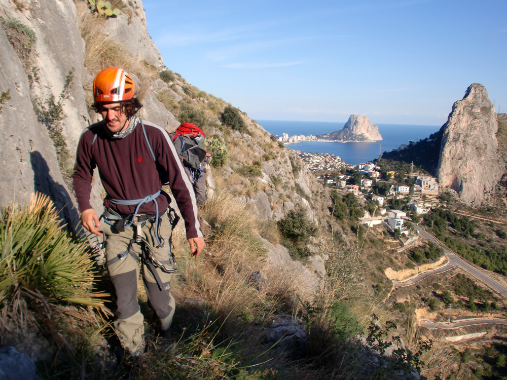 Nacho y Solete durante el delicado descenso de la aguja superior, con Toix y el Peñón como telón de fondo.