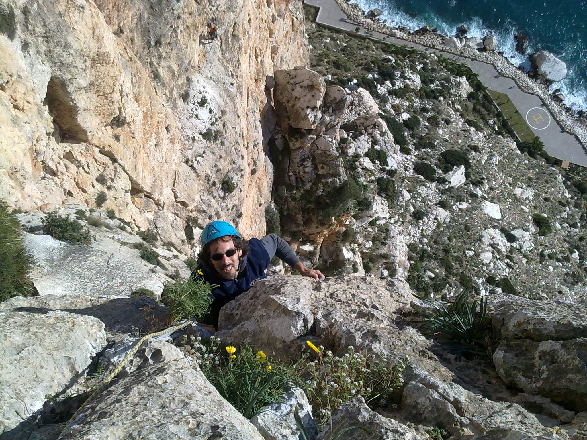 Solete llegando a la reunión del último largo. A sus espaldas se aprecia cláramente el espolón por donde discurren la vía Costa Blanca, y un escalador, con casco amarillo, más arriba en una de sus reuniones.
