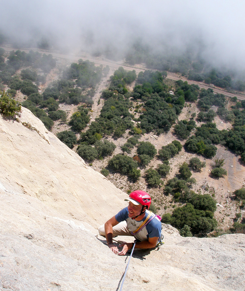 La cara de Javi denota que está disfrutando de este magnífico día de escalada sobre el amenazante mar de nubes.