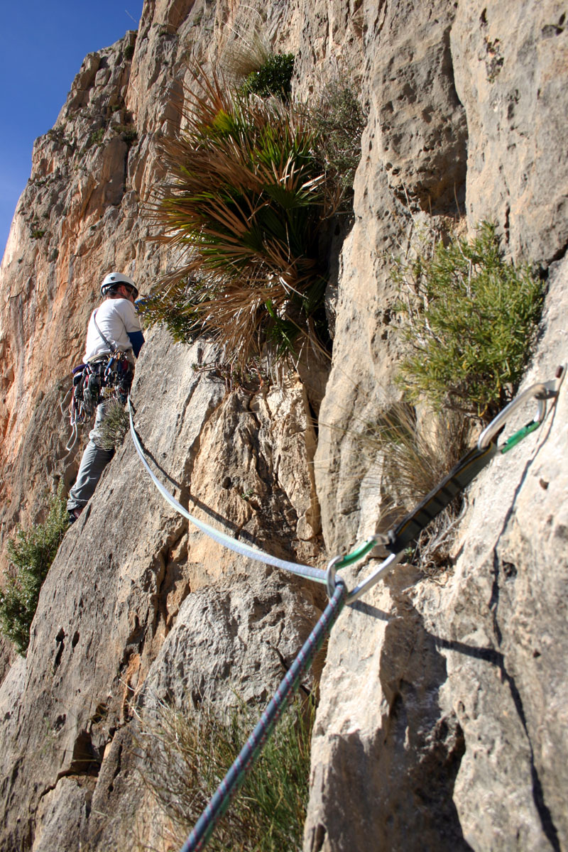 Will en la travesía de salida del segundo largo. Se puede apreciar el estado de los seguros antes de su restauración. Viejos espits de dudoso aspecto que han sido sustituidos por parabolts.