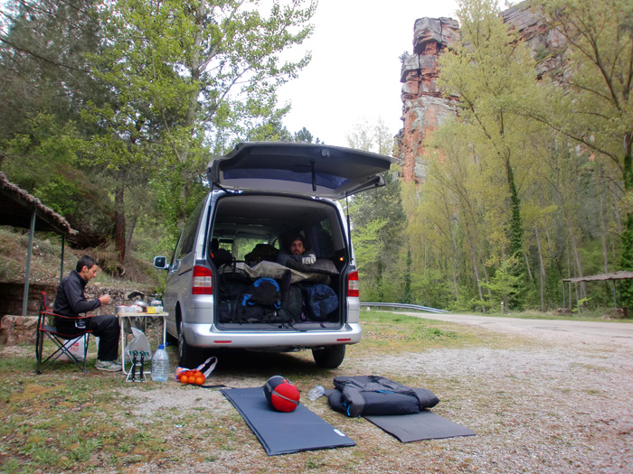 Desayunando junto a la furgo despues de haber vivaqueado en el parking.