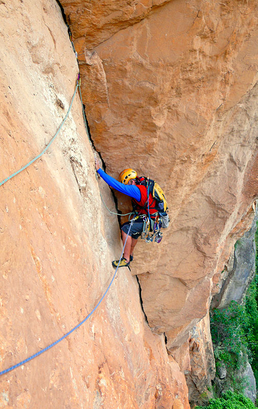 Ramón Cadalàs escalando en la fisura del primer largo de esta hermosa vía. Hoy toca lavarle la cara, haciendo un buen trabajo de restauración.