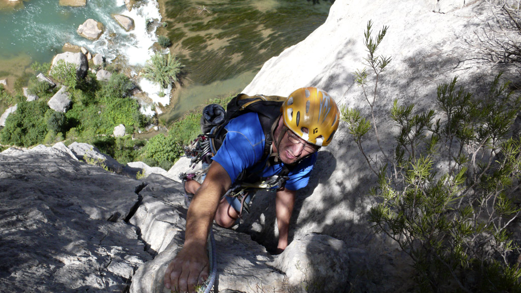 Ramón Cadalàs escalando los primeros metros de la vía Blas Gordo, que junto con Jaime Arviza ha restaurado esta clásica vía de Montanejos