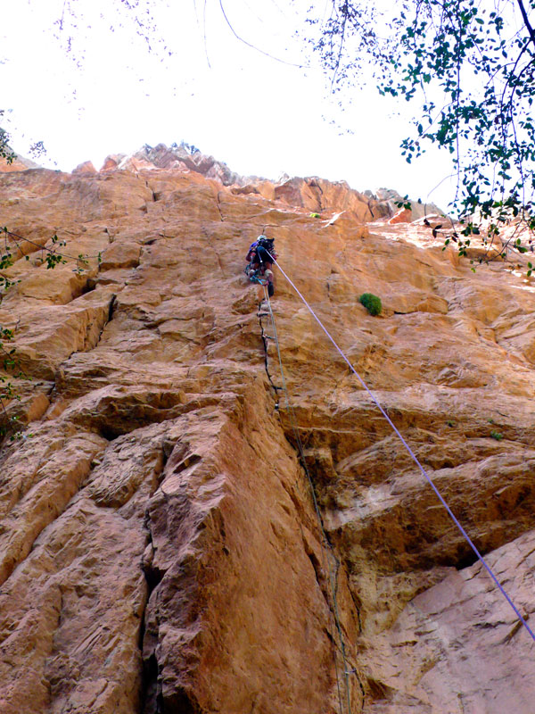 Jaime Arviza, en el primer largo de fisura desplomada, restaurando la vía Jijijaja.
