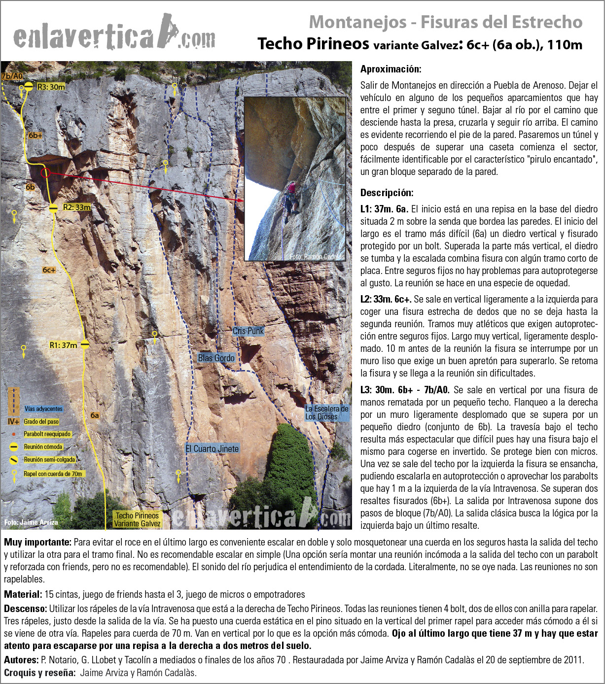 Reseña de la vía Techo Pirineos variante Galvez en Montanejos, restaurada por Jaime Arviza y Ramón Cadalás.