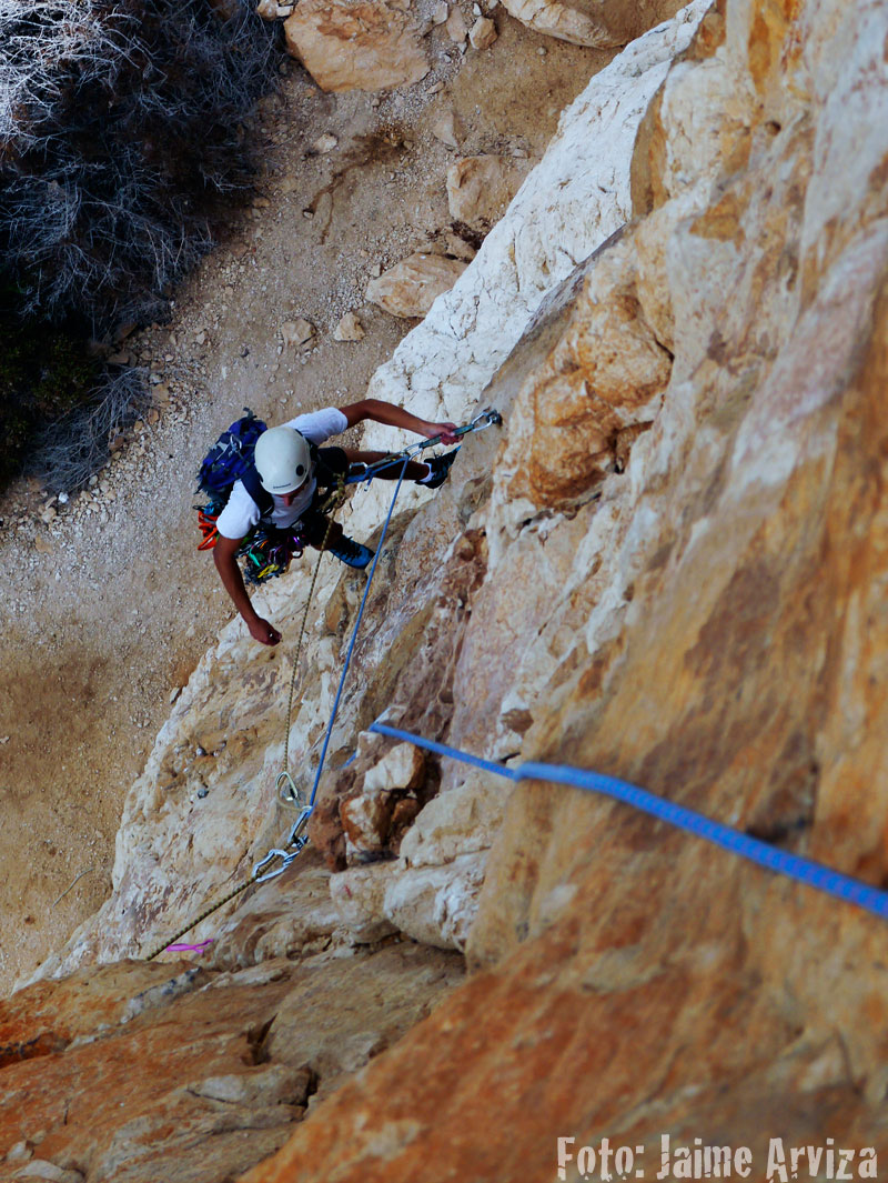 Merli en uno de los pasos que da el grado a esta gran vía... Espacio Libre 6c/A2 310m.