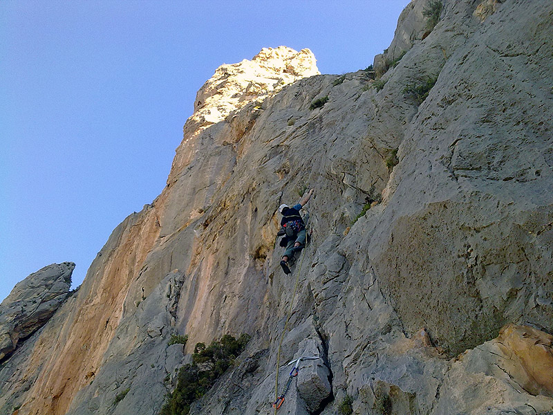 Carlos lidiando con los primeros metros de la vía. En manga corta en pleno enero. La verdad es que pasamos bastante frío en este primer largo.