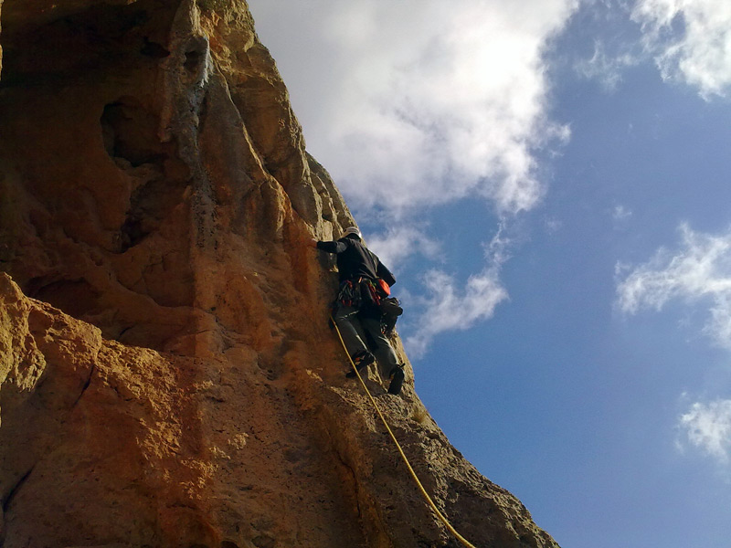 Carlos, en los primeros pasos del tercer largo, saliendo de la cueva por la derecha.