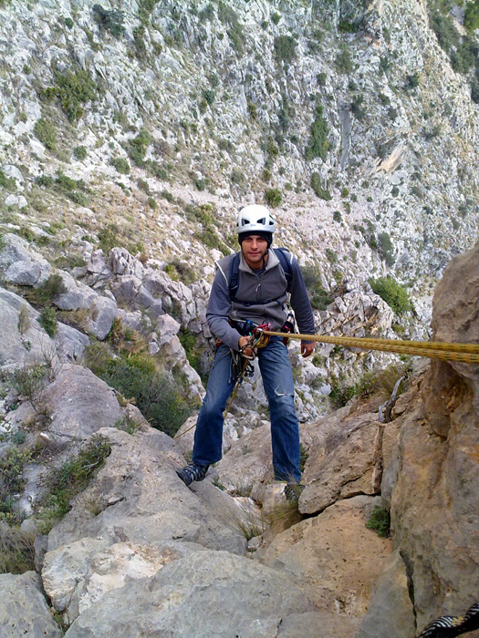 Rapelando hacia el barranco del Infierno desde el collado que separa el espolón Aristóteles de la cresta Pepsi. Se hacía un poco tarde para hacer la cresta.