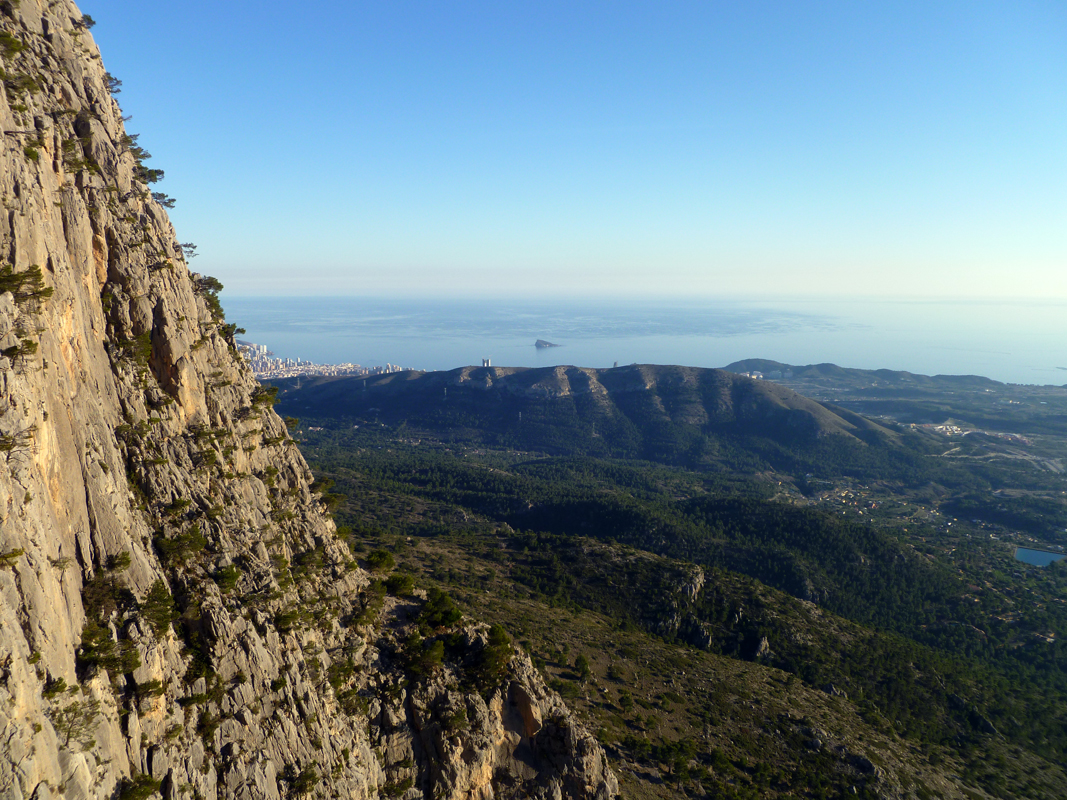 La zona del espolón central en primer término, y al fondo la isla de Benidorm y los edificios más altos sobresalen por encima de las montañas.