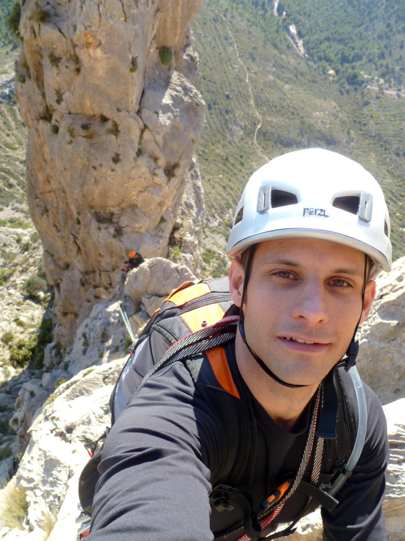 Mientras Jose deshace la maraña en la que se ha convertido la cuerda tras el corto rápel en el collado que separa la arista Aristóteles de la cresta Pepsi, yo aprovecho para hacernos una foto a los dos.