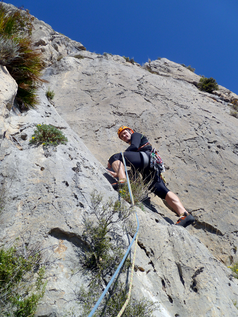 Tras la gran terraza, podemos hacer un largo muy variado y no del todo evidente por una serie de fisuras, diedros y placas. Jose, en su primer largo de autoprotección escalando de primero. Enhorabuena!!