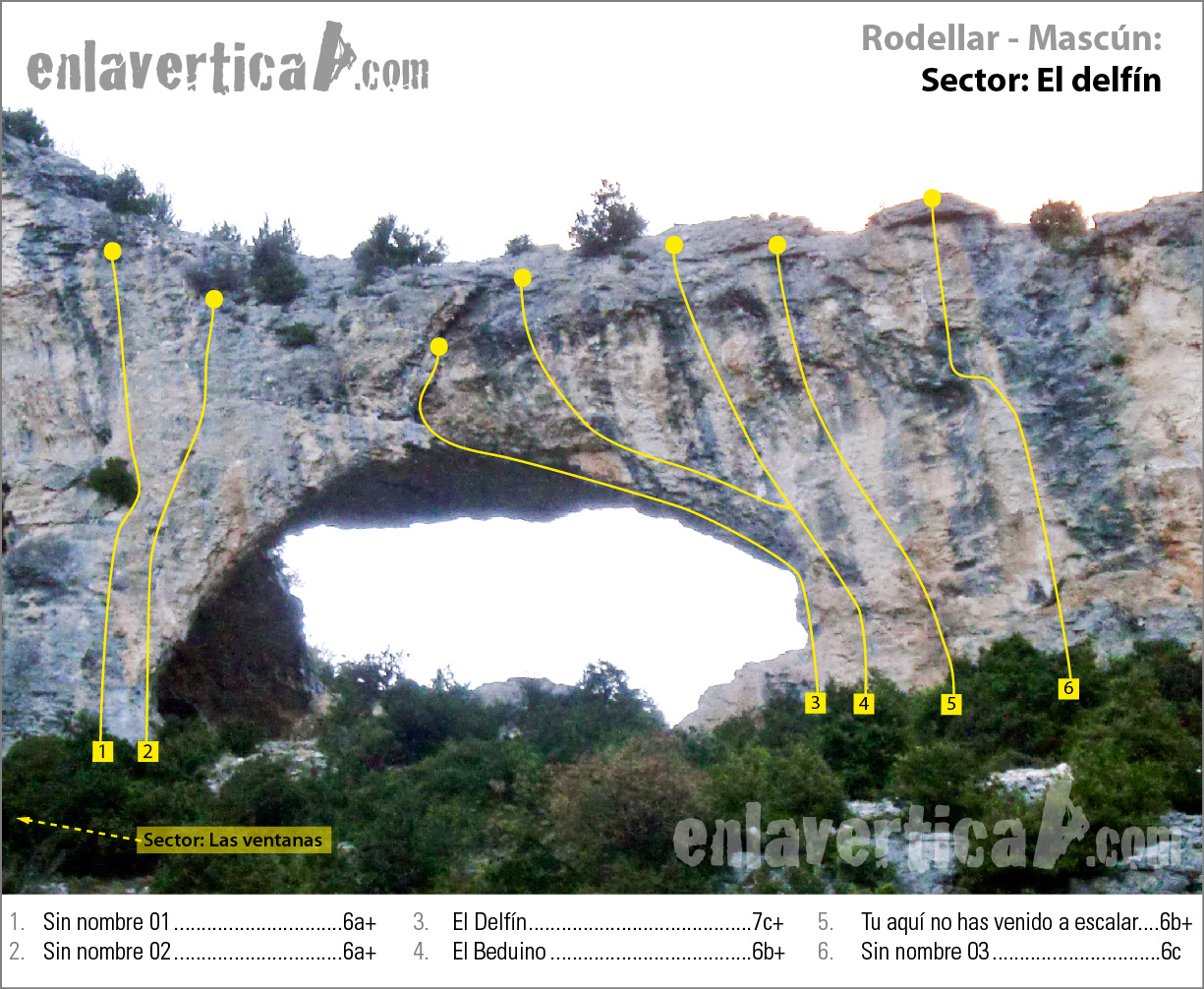 Reseña del sector el Delfín de la zona del Mascún en la escuela de escalada de Rodellar