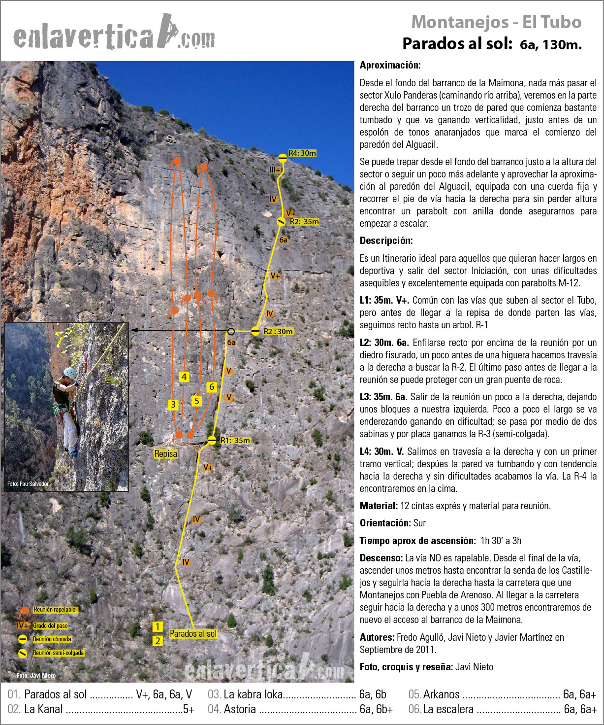 Reseña del sector el Tubo y la vía de Parados al sol, en la escuela de escalada de Montanejos