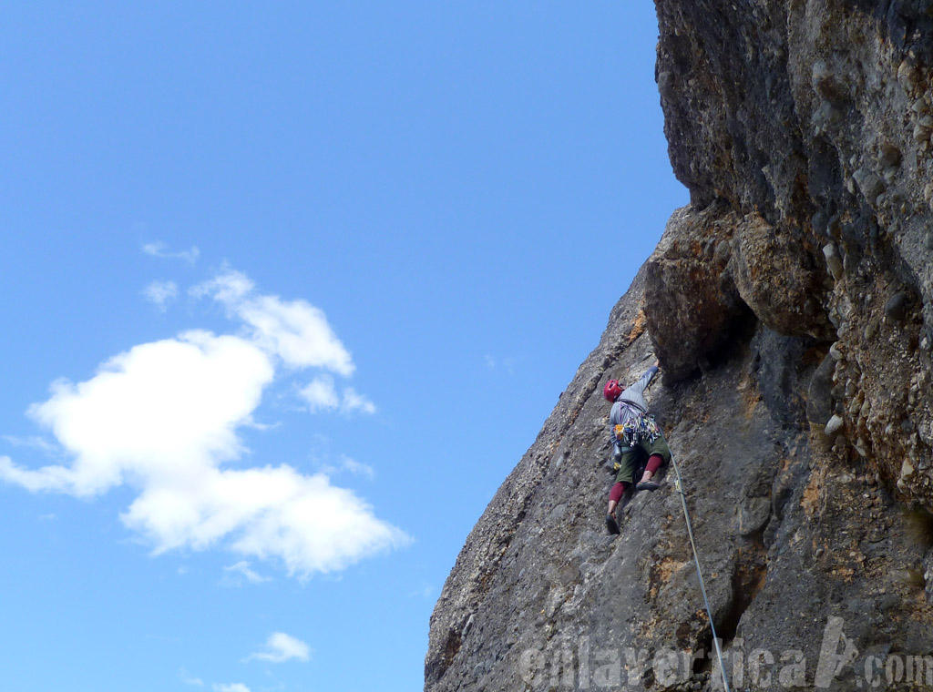 Javi Nieto a punto de superar el pequeño desplome del largo clave de la vía.