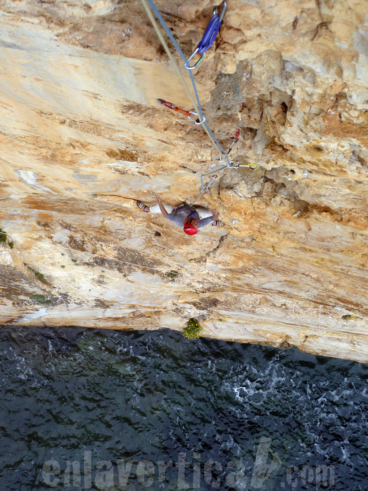 Javi escalando el espectacular segundo largo, con el Mediterraneo como telón de fondo.