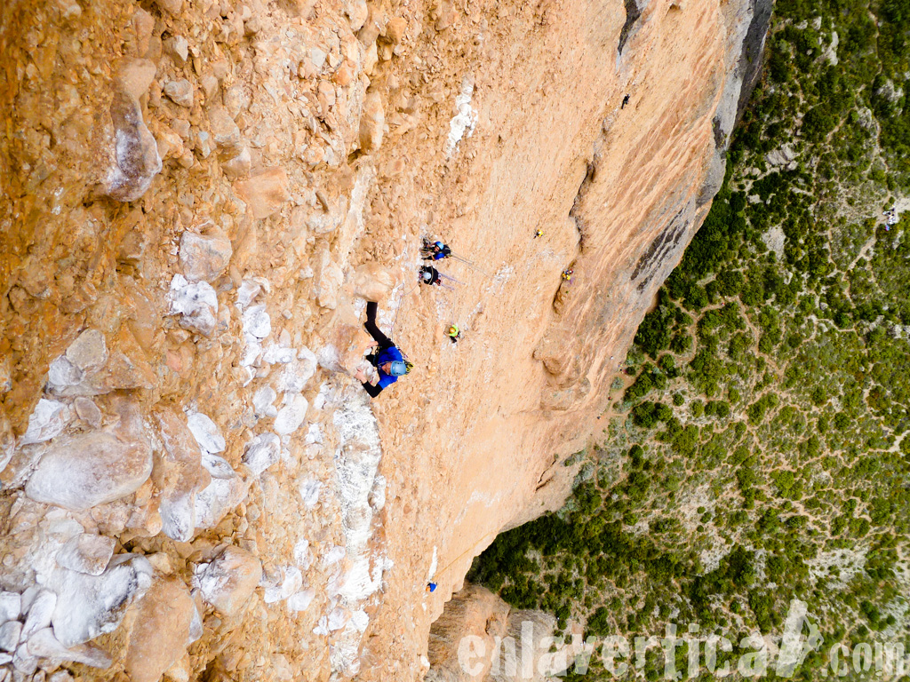Debido al gran desplome la lluvia prácticamente nunca moja la pared y el magnesio se acumula. Foto tomada durante la cuarta edición del Rally 12 horas Tech Rock de Riglos 2012