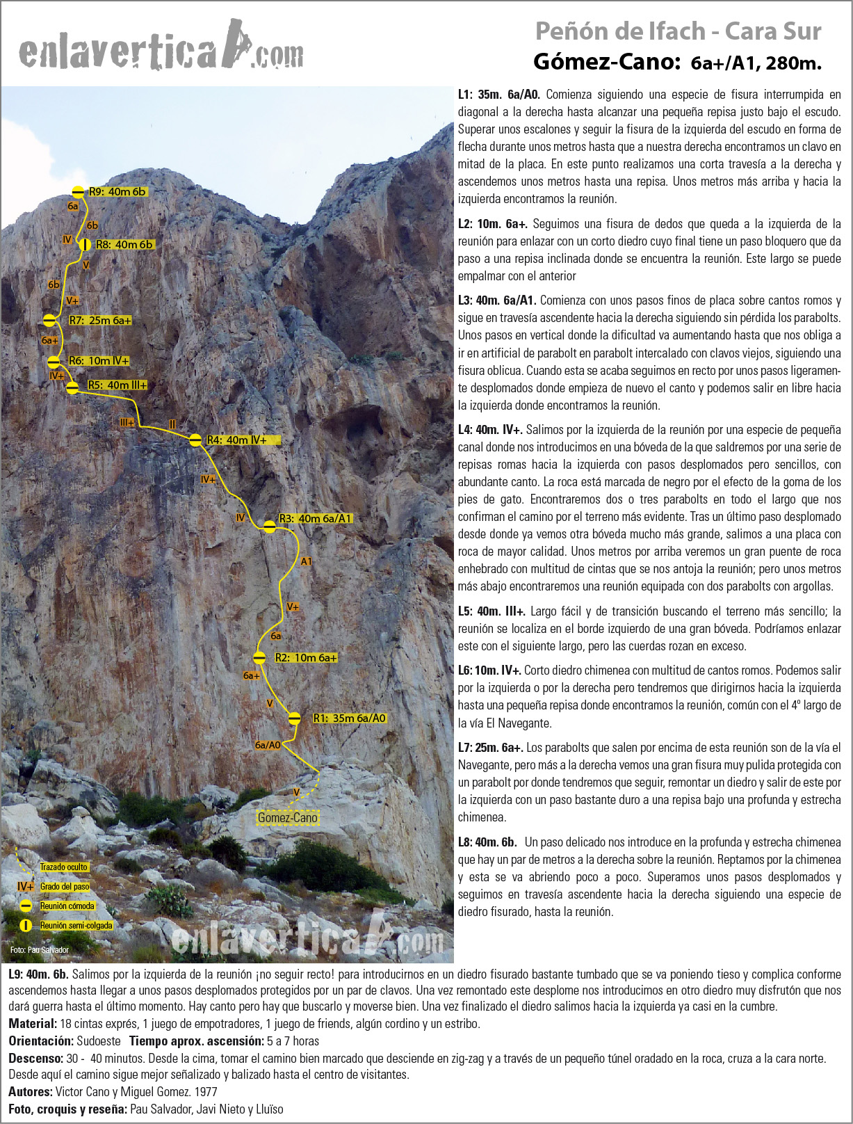 Reseña de la vía Gomez-Cano en la cara sur del Peñón de Ifach. Una de las grandes clásicas del Peñón, fue la primera vía abierta en esta cara. Sin duda no nos dejará indiferentes. Cuenta con tres partes claramente diferenciadas, los primeros tres y los últimos tres largos nos harán escalar y en medio una transición que nos dará un respiro sorteando varias bóvedas por terreno sencillo. Guarda lo mejor y más duro para el final.