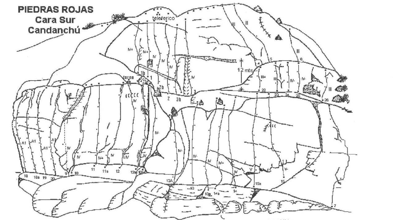Reseña dibujada de las vías de Piedras rojas, cercana a Candanchú.