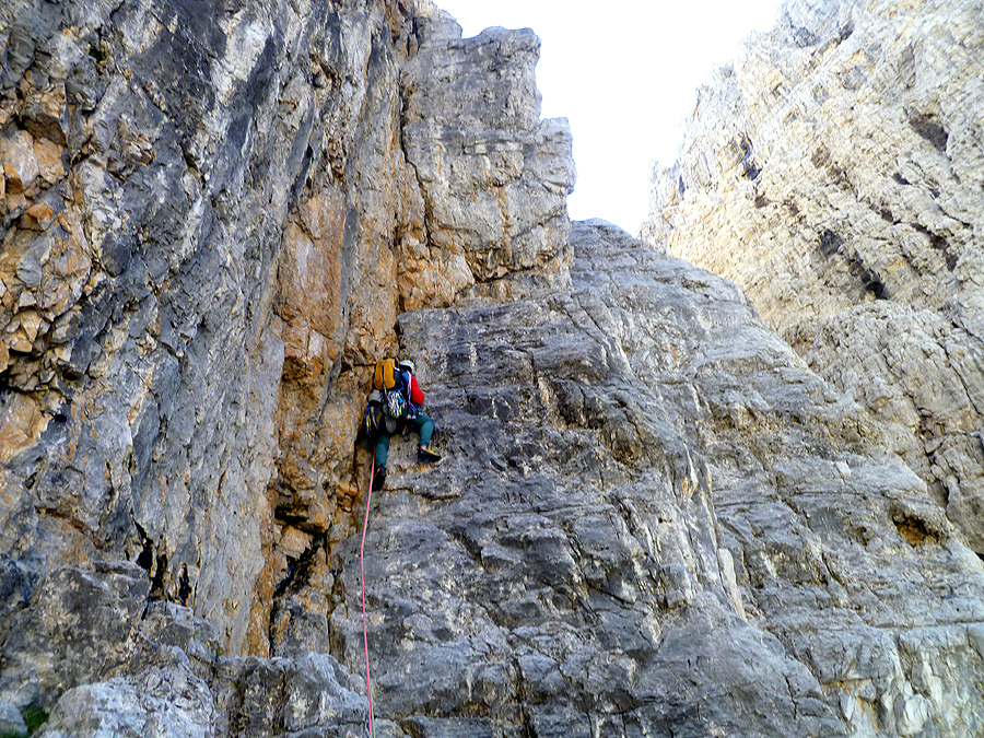 Ramón Cadalàs en el primer largo, luchando contra el frío, la pared aún estaba en sombra.
