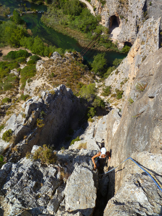 Ali escalando el primer largo. Al fondo unas preciosas vistas sobre el río Cabriel.