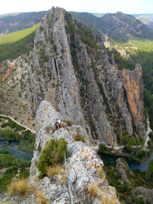 Ali recorriendo la aérea cresta cimera. Tras ella una preciosa vista del río Cabriel y las agujas de la parte de Cuenca.