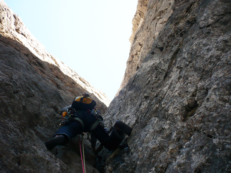 Javi luchando contra el frío en el primer gran diedro de la Fehrmann. En la reunión de este largo empezaron a alcanzarnos los rayos del sol.