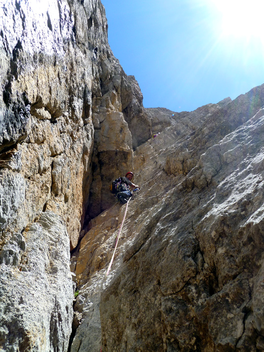 Javi disfrutando del sexto largo, iluminado por el sol.