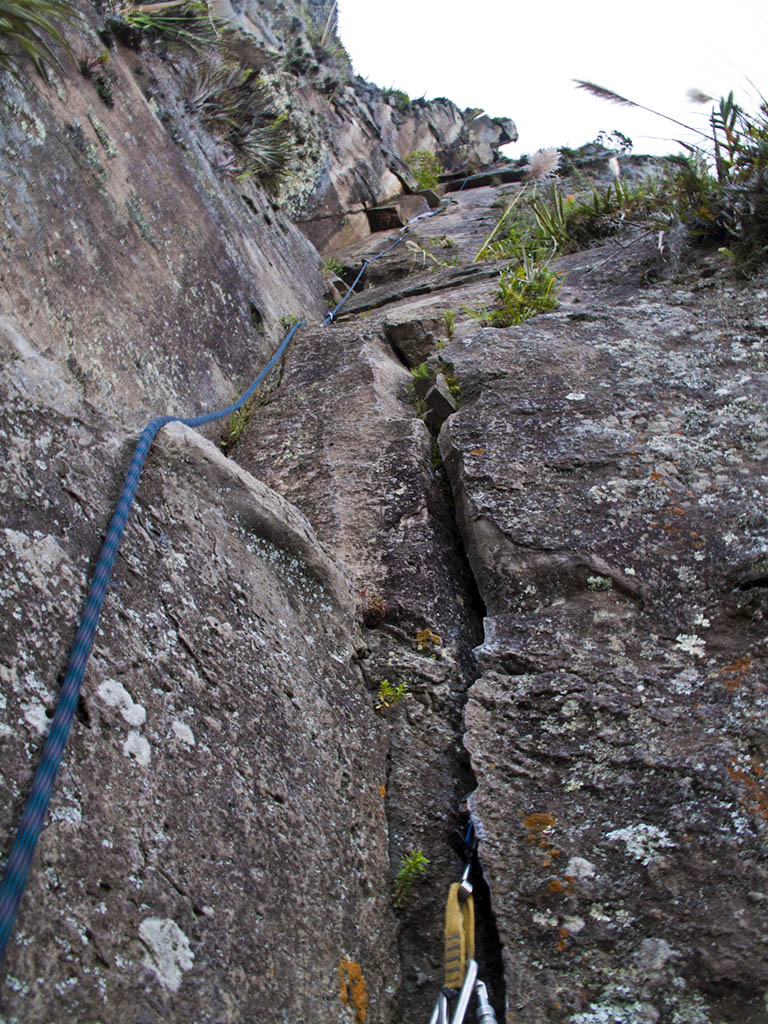 Reunión del primer largo de la vía Capac-ñan. Vemos una hermosa fisura donde poner un par de friends y hacer la reunión.Y de aquí empieza el segundo y evidente largo. Una combinación de fisuras, empotramientos, babaresas y placa... qué más se puede pedir!!!