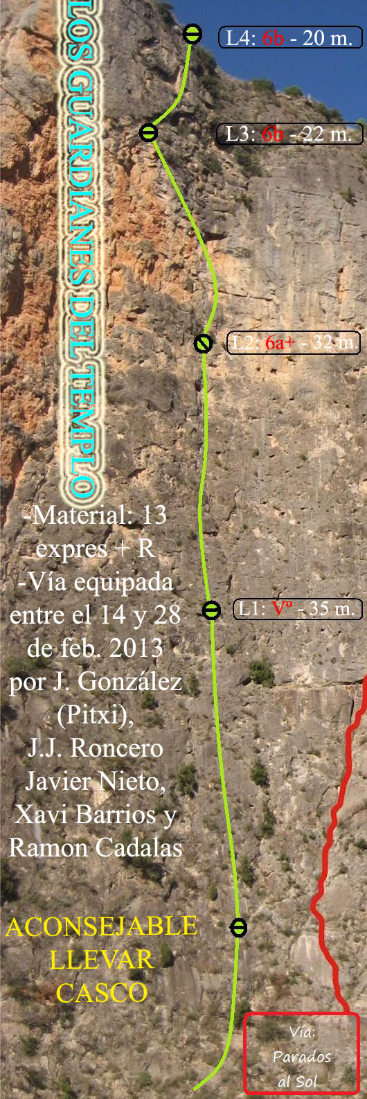 Croquis sobre fotografía de la vía Los Guardianes del templo, equipada entre el 14 y 28 de febrero de 2013 por J.Gonzalez (Pitxi), J.J. Roncero, Javi Nieto, Xavi Barrios y Ramón Cadalàs. Croquis enviado por este último.