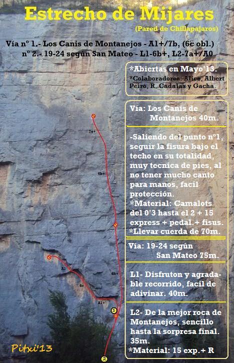 Reseña sobre foto a color de las vías Los Canis de Montanejos y 19-24 según San Mateo editada por su autor, Javier González (Pitxi)