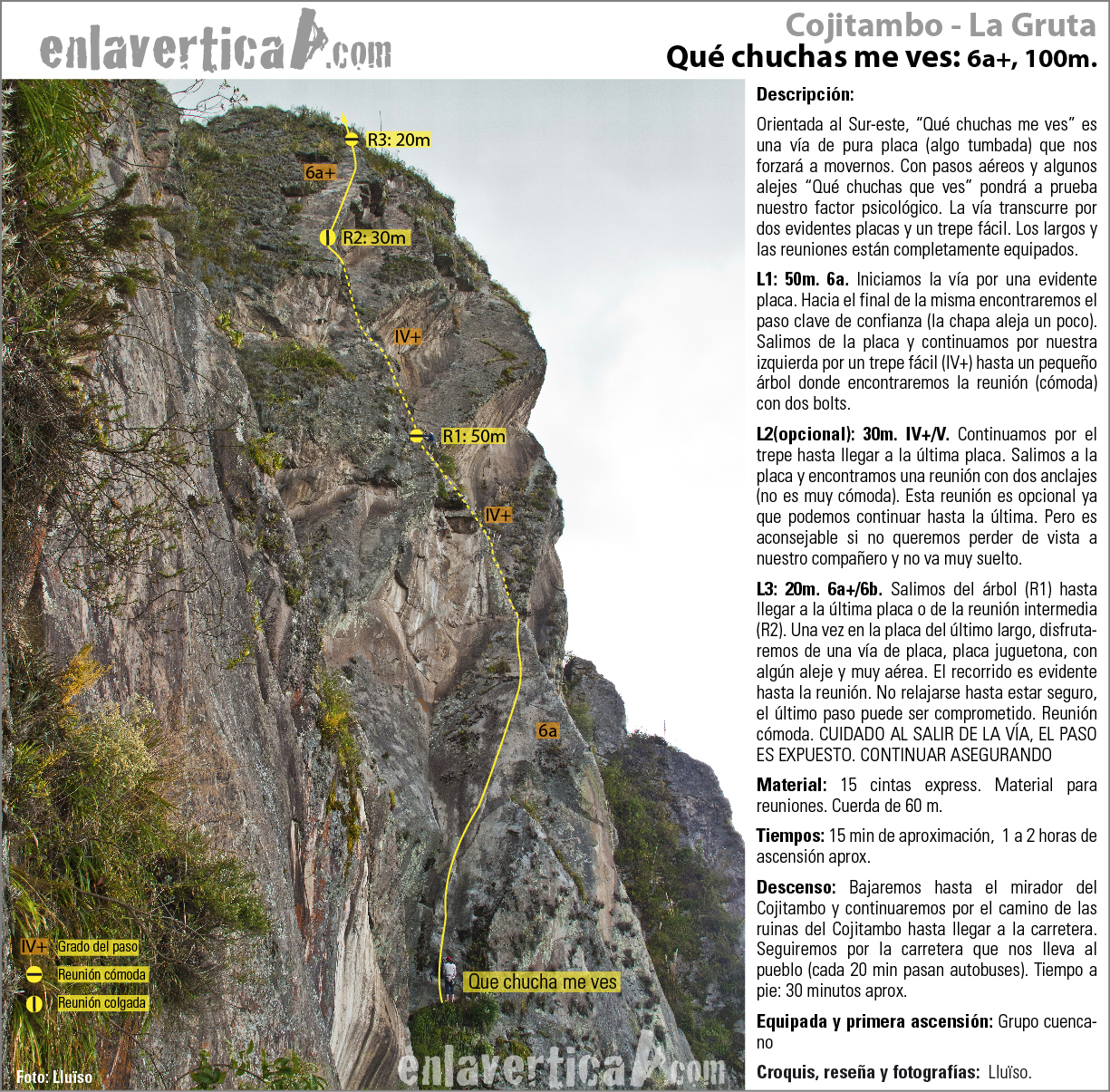 Orientada al Sur-este, “Qué chuchas me ves” es una vía de pura placa (algo tumbada) que nos forzará a movernos. Con pasos aéreos y algunos alejes “Qué chuchas que ves” pondrá a prueba nuestro factor psicológico. La vía transcurre por dos evidentes placas y un trepe fácil. Los largos y las reuniones están completamente equipados.