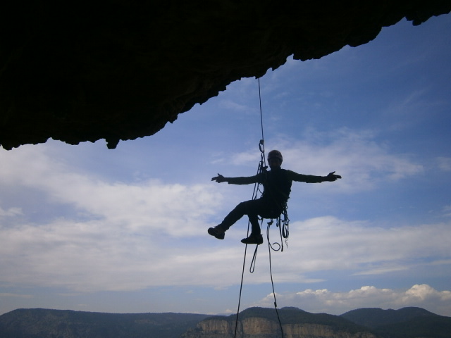 ...jumando en la apertura,vistas del pantano, desde la cueva del primer largo...