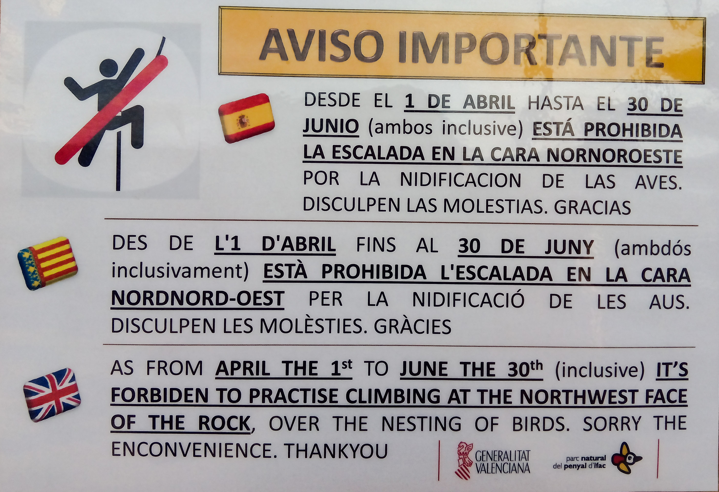 Desde el 1 de abril hasta el 30 de junio (ambos inclusive) está prohibida la escalada en la cara nornoroeste por la nidificación de las aves.