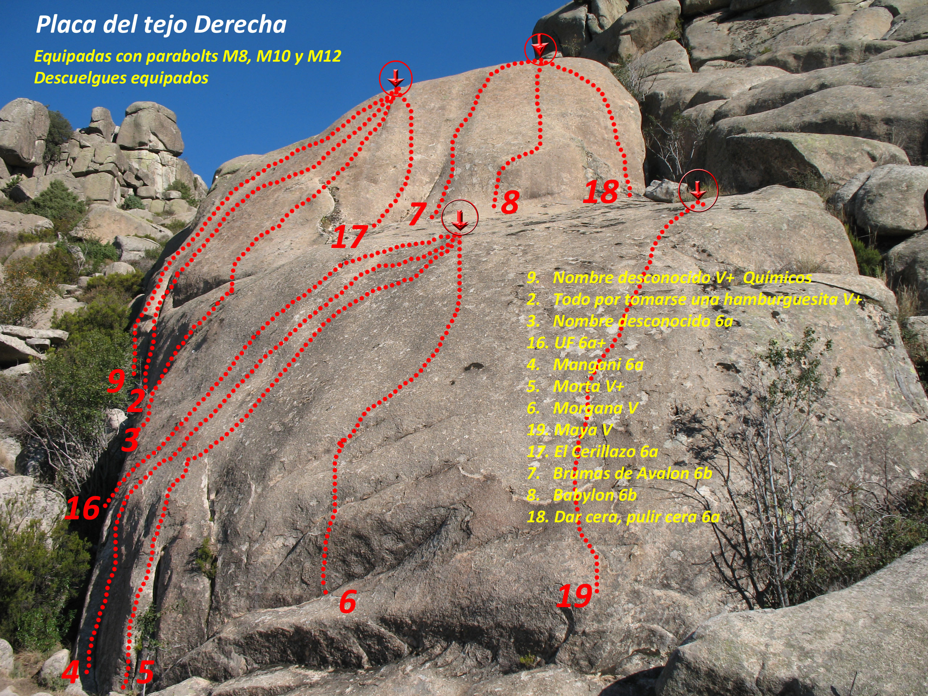 Actualización y puesta al día de vías en la placa del Tejo (derecha) de croquis existente. Hecho con las indicaciones e información del aperturista José Luis Serrano, quien es el creador de muchas de las vías de la zona.