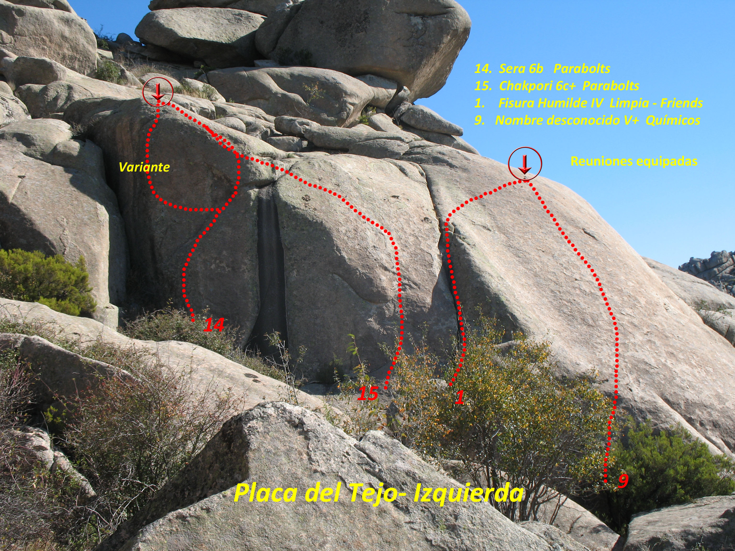 Actualización y puesta al día de vías en la placa del Tejo (izquierda) de croquis existente. Hecho con las indicaciones e información del aperturista José Luis Serrano, quien es el creador de muchas de las vías de la zona.