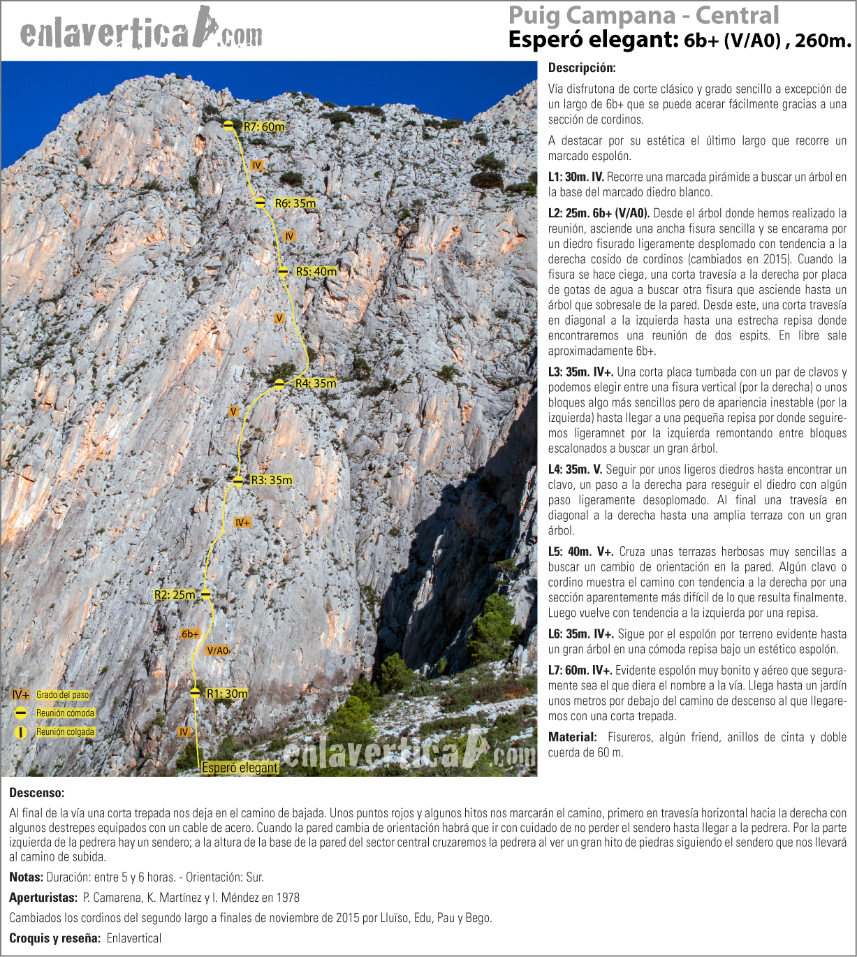 Vía disfrutona de corte clásico y grado sencillo a excepción de un largo de 6b+ que se puede acerar fácilmente gracias a una sección de cordinos. A destacar por su estética el último largo que recorre un marcado espolón.