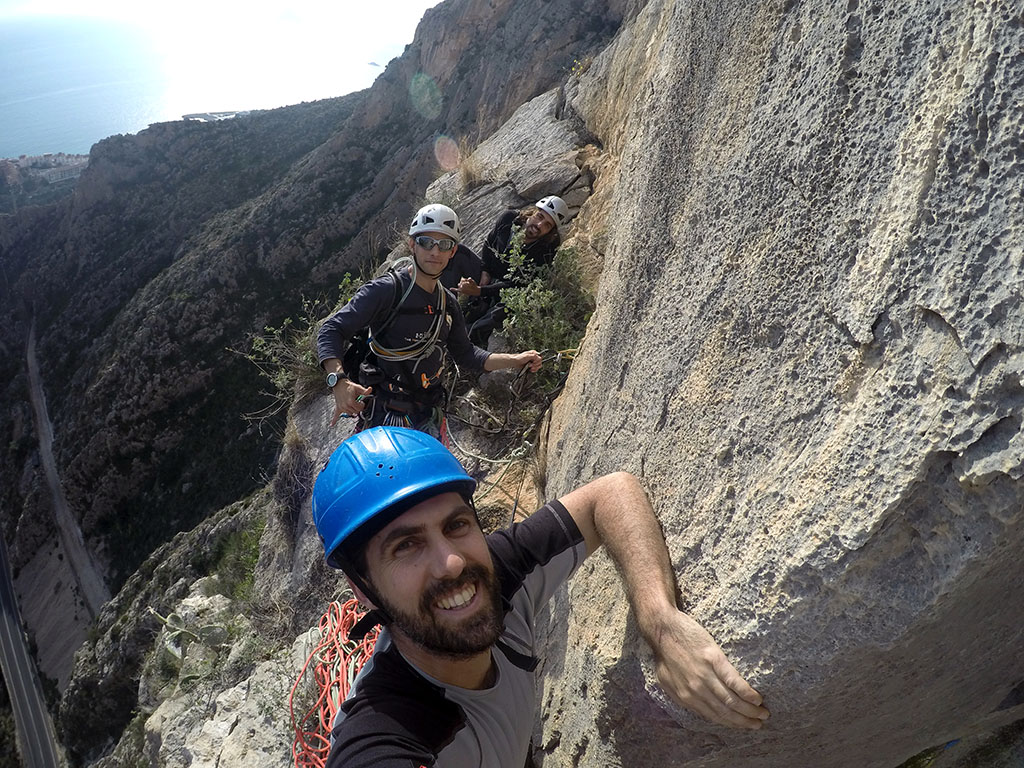 El trio calavera en la reunión del cuarto largo, antes de afrontar el largo de la vía