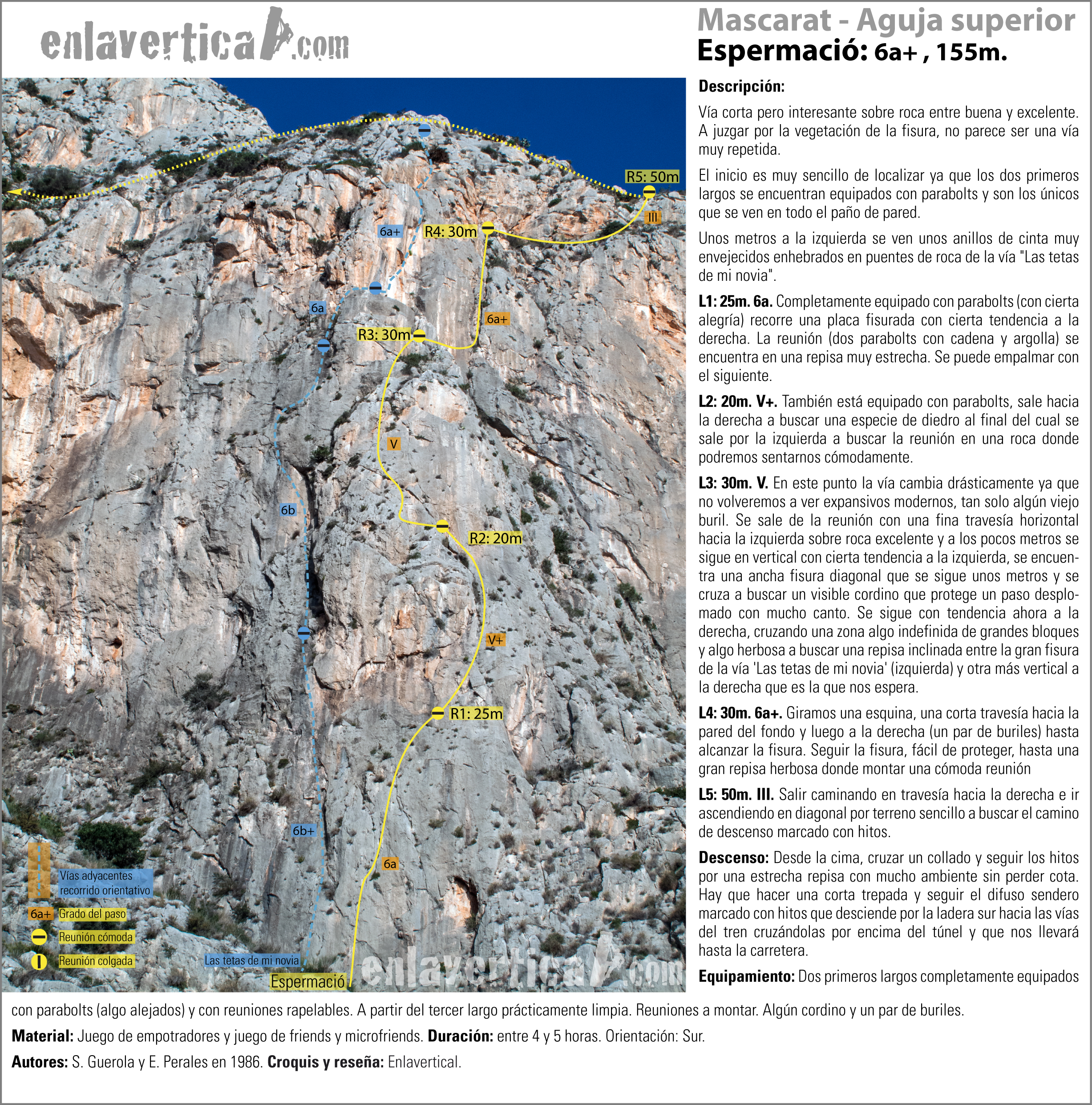 Vía corta pero interesante sobre roca entre buena y excelente. A juzgar por la vegetación de la fisura, no parece ser una vía muy repetida. El inicio es muy sencillo de localizar ya que los dos primeros largos se encuentran equipados con parabolts y son los únicos que se ven en todo el paño de pared. Unos metros a la izquierda se ven unos anillos de cinta muy envejecidos enhebrados en puentes de roca de la vía "Las tetas de mi novia".