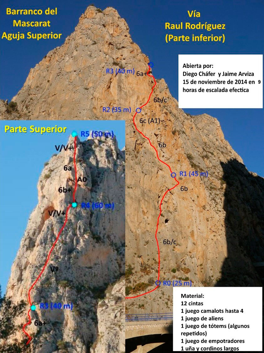 Croquis sobre fotografía a color de la vía Raul Rodríguez a la Aguja superior del Mascarat.