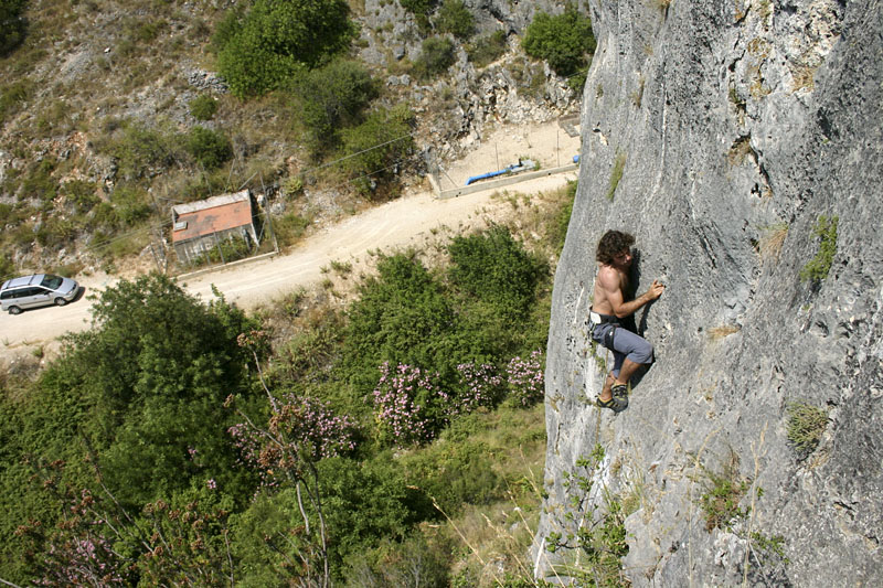 Con vistas al aparcamiento de la escuela, Pablo dándolo todo en una de sus primeras vías de primero.