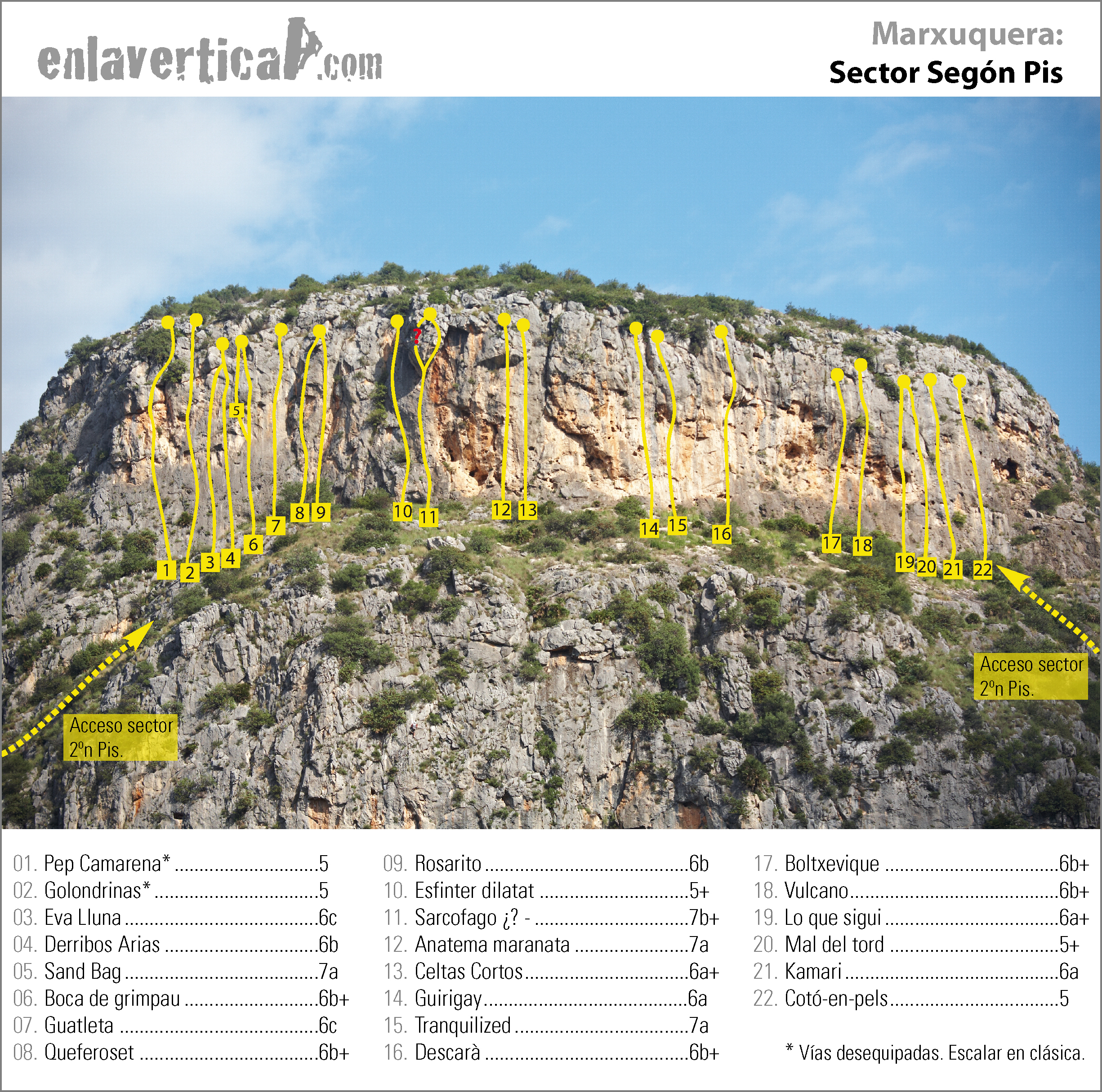 Reseña del sector Segón Pis de la Marxuquera. Vías de placa con pancha de unos 20m.