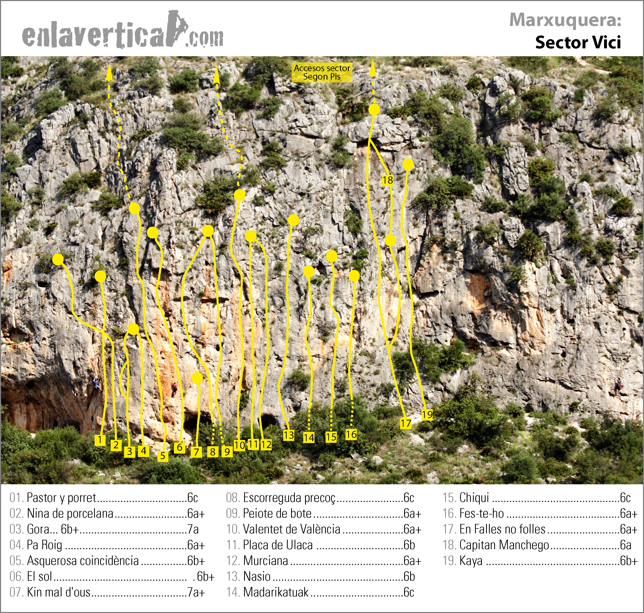 Reseña del sector Vici de la Marxuquera. Vías de placa y techos entre 25 y 40m.